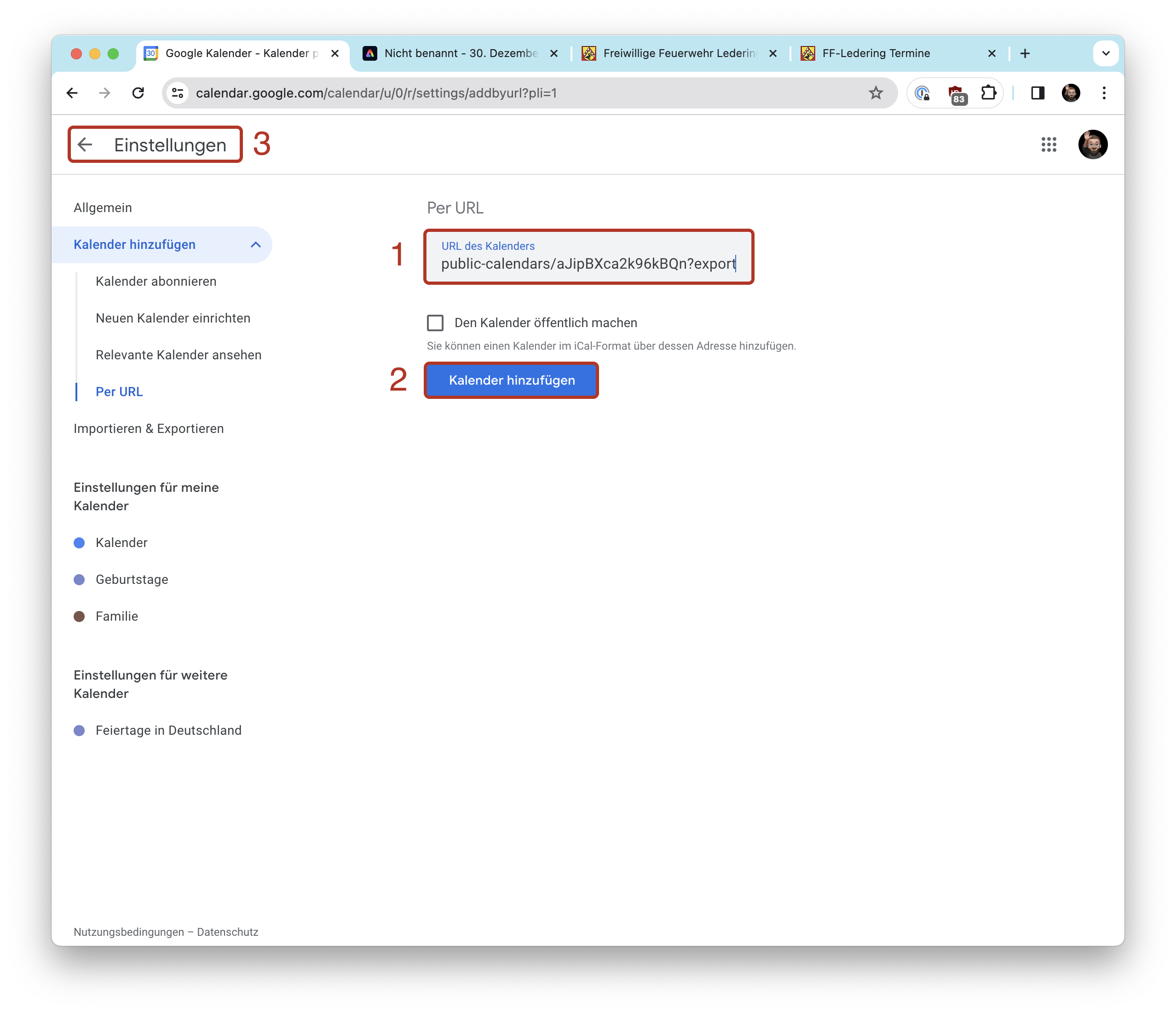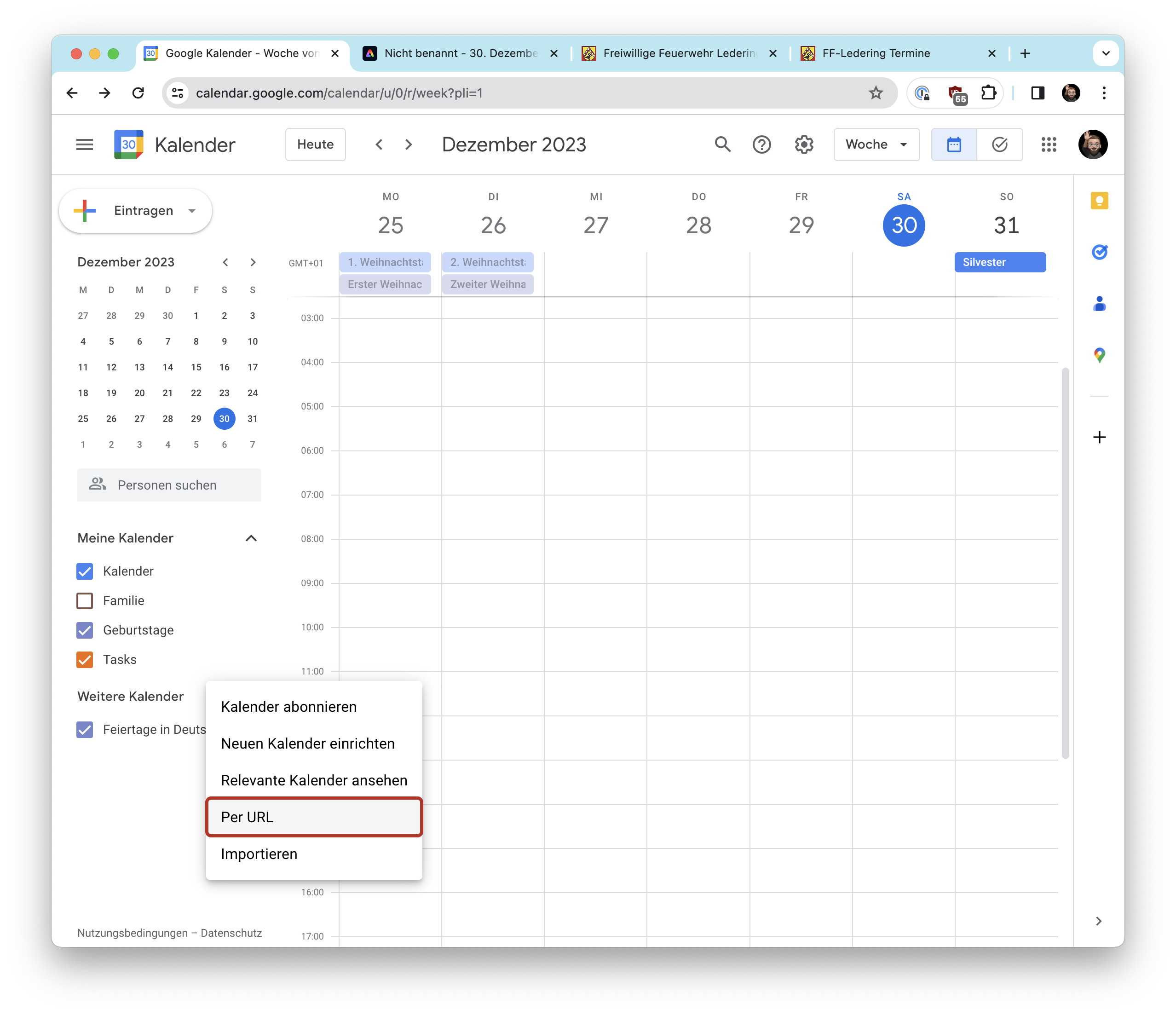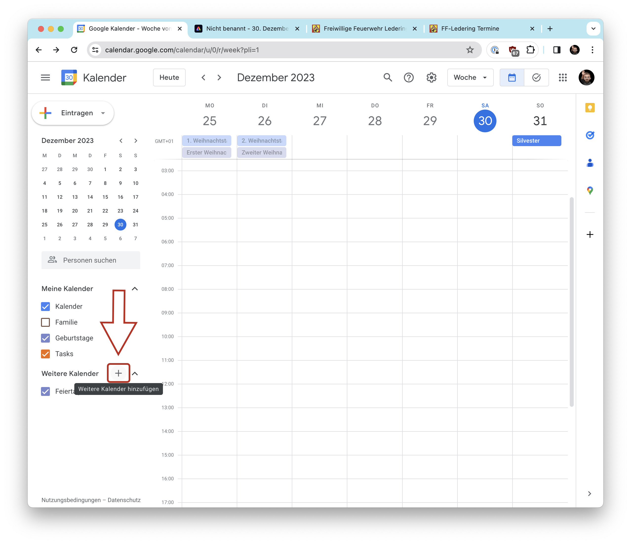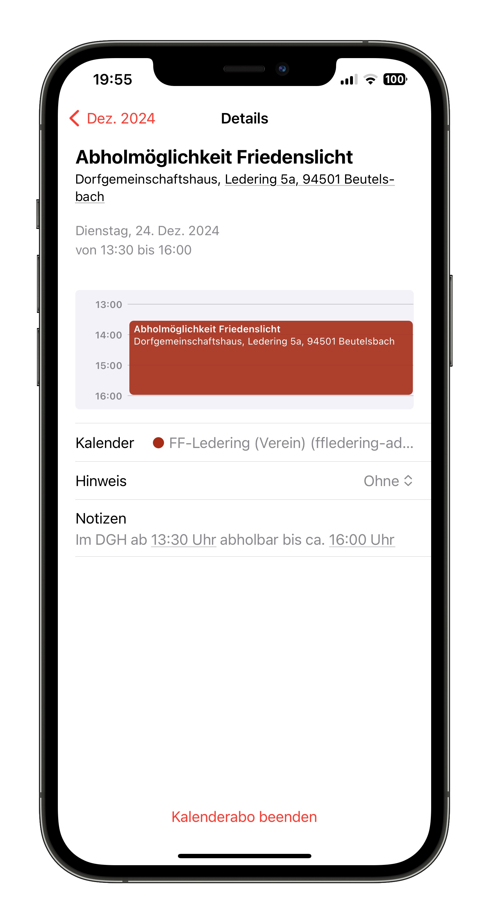 | Do., 24. Dez. | 13:30 | Abholmöglichkeit Friedenslicht Friedenslicht aus dem Heiligen Land im Dorfgemeinschaftshaus ab 13.30 Uhr bis ca. 16.00 Uhr Dorfgemeinschaftshaus Ledering |